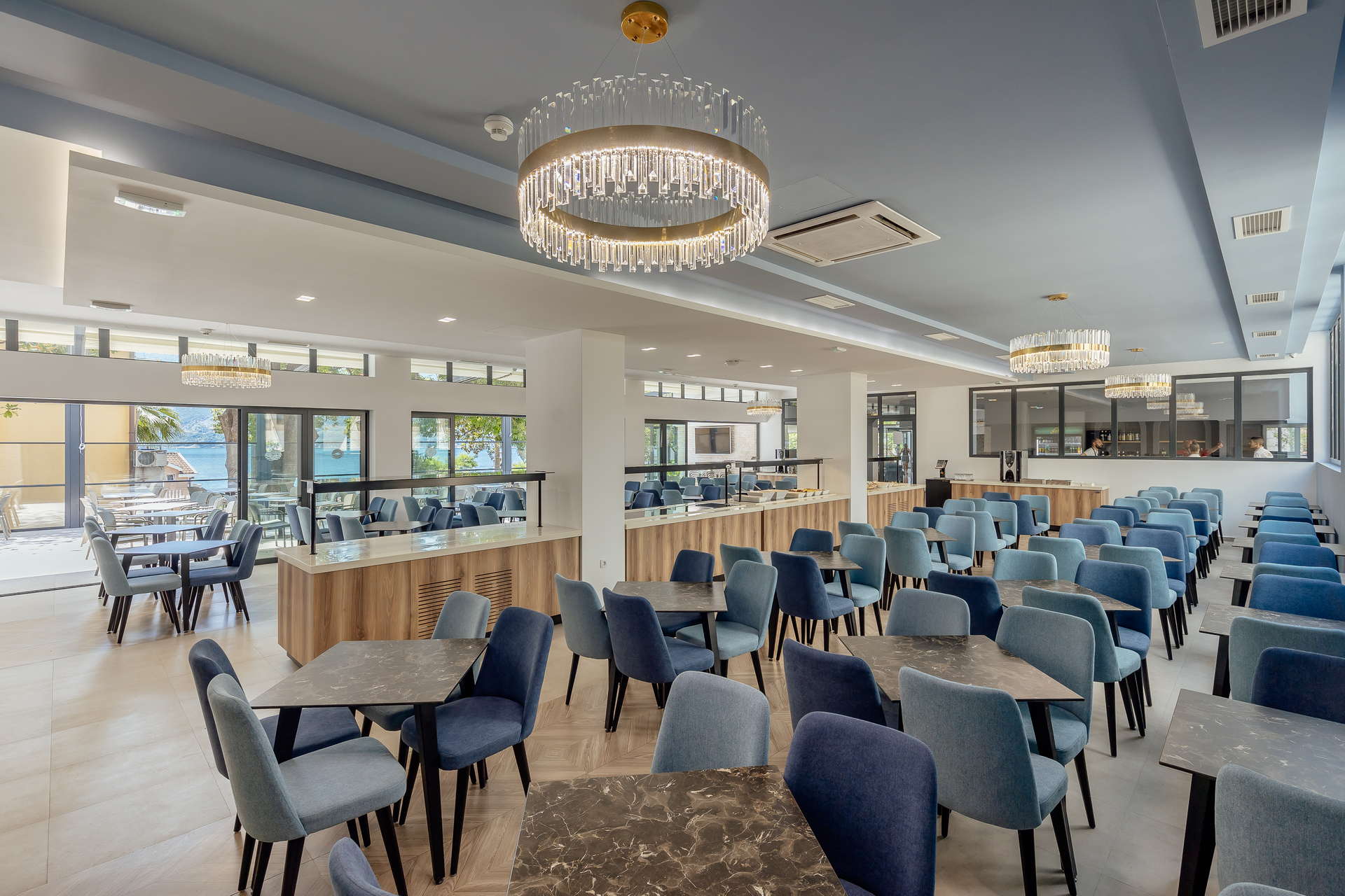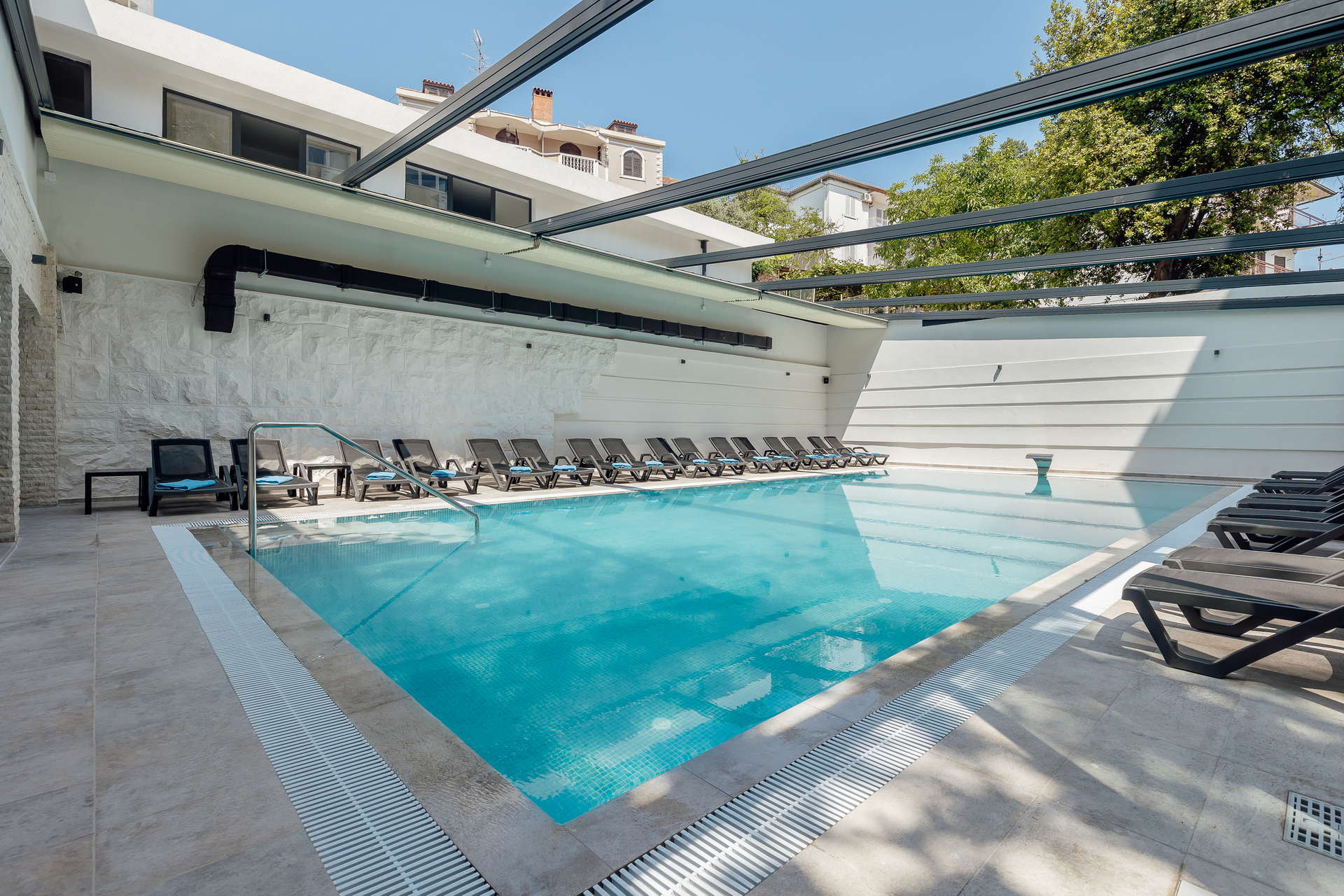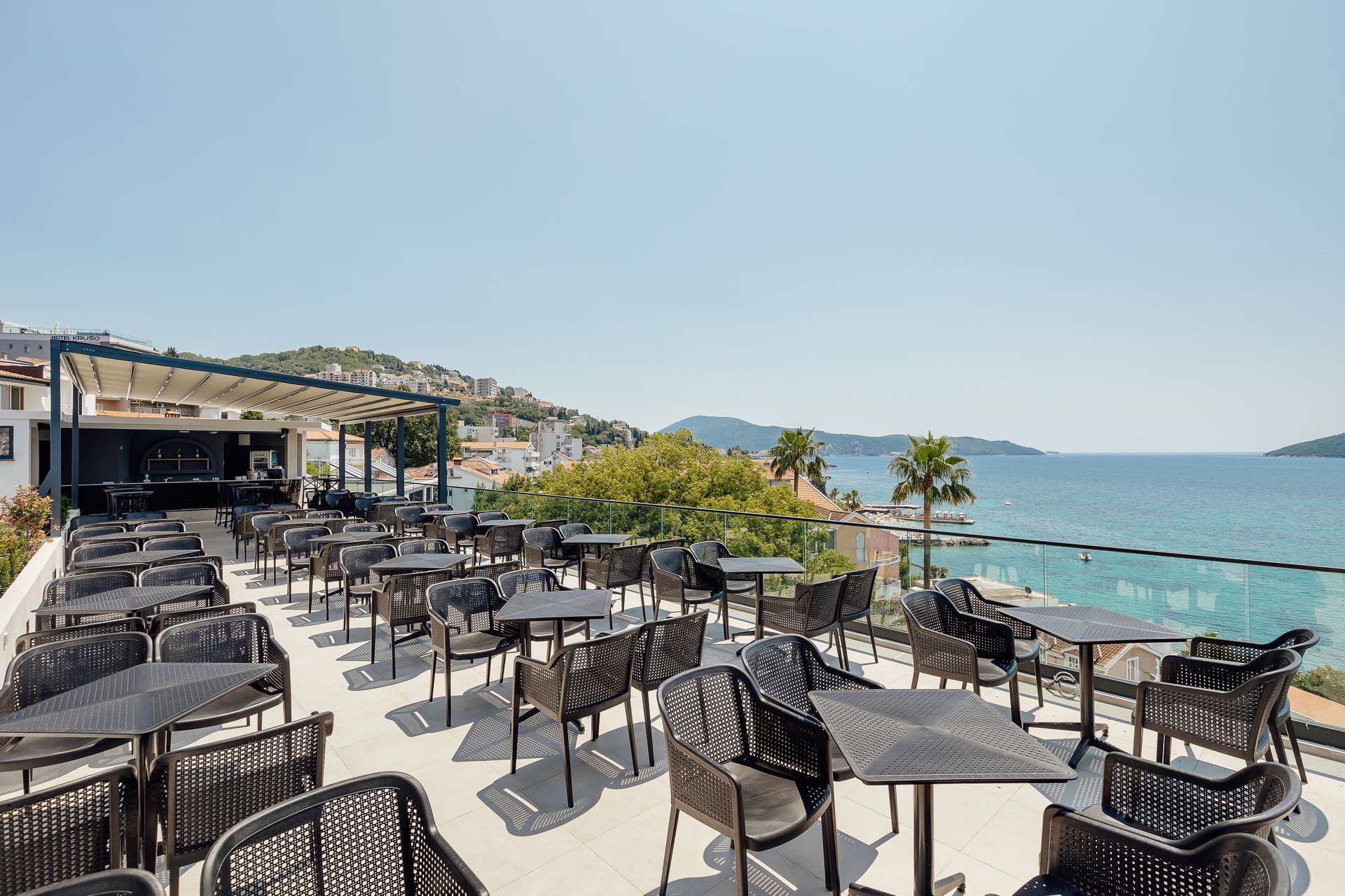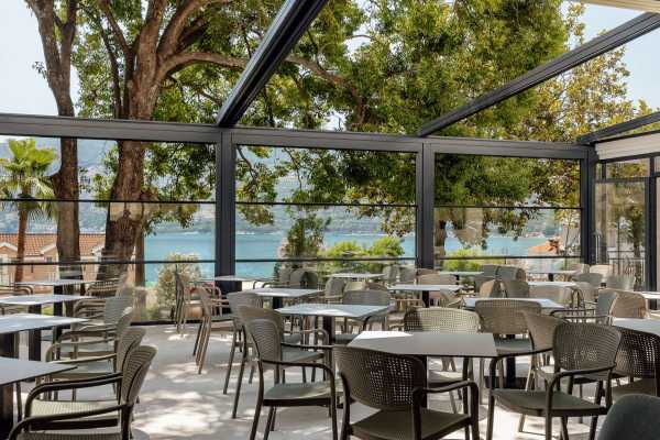 Na samom ulazu hotela goste dočekuje veliko dvorište i bašta prekrivena travnjakom i mediteranskim biljkama među kojim se izdvaja i drvo kanfor, jedinstveno drvo u Crnoj Gori. Prijatan i miran ugođaj pruža i velika terasa restorana koja gleda u dvorište gdje gosti provode najviše vremena u toplim ljetnjim večerima.