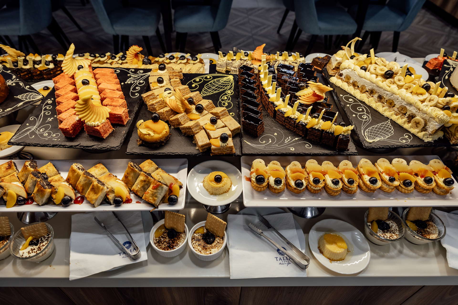 Od sadržaja hotel TALIA nudi: tri hotelska bara, restoran sa terasom, show kitchen u restoranu, Spa i Wellness centar, igraonicu i igralište za djecu, prostoriju za odlaganje prtljaga, servis za pranje i sušenje veša, kongresnu salu, parking i 24 h recepciju. Hotel ima saradnju sa lokalnim turističkim agencijama koje organizuju jednodnevne izlete, transfere i nude rent-a-car, pa gosti na recepciji hotela mogu zakazati neki od izleta ili iznajmiti auto.